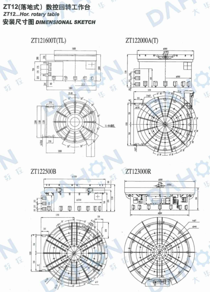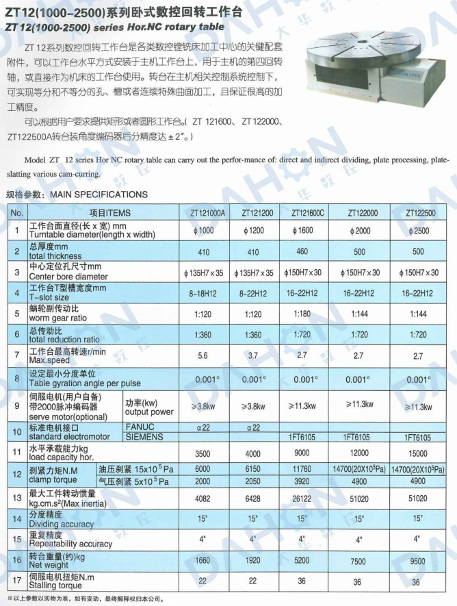 Model ZT 12 series Hor NC rotary table can carry out the perfor-mance of. direct and indirect dividing. plate processing, plate-satting various cam-curring.